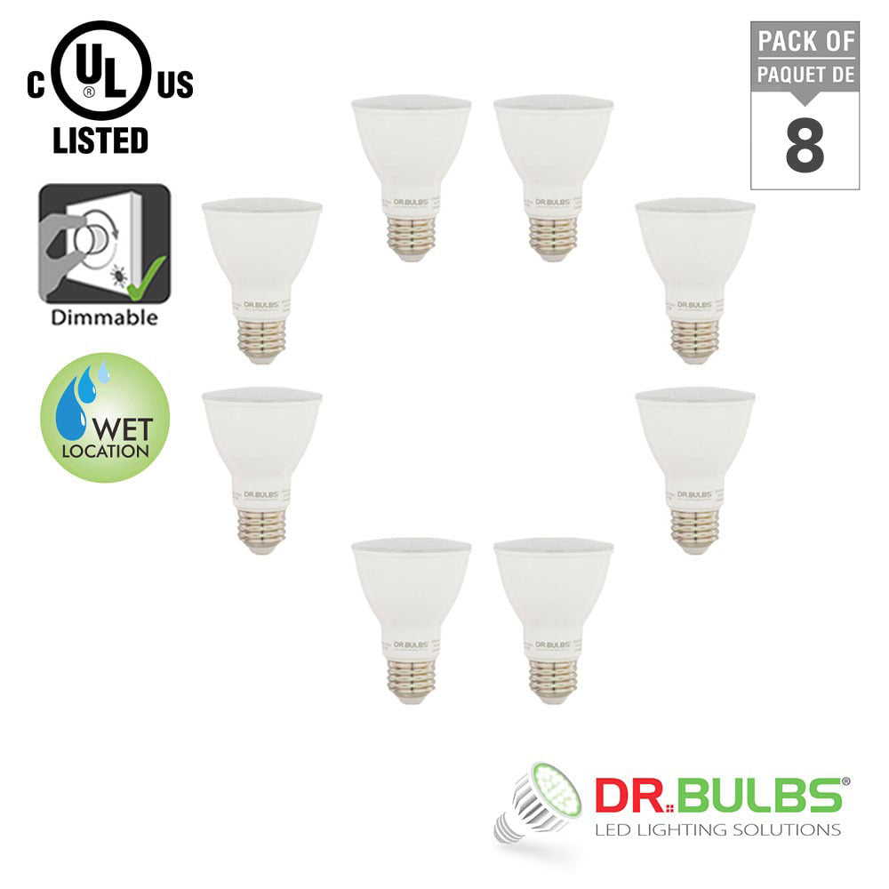 8 Pack Dr.Bulbs PAR20 7W (Replace 50W Halogen) 5000K Bright White Dimmable LED Bulb Wet Location RatedUse only 7 Watts to generate light equivalent to 50 Watts halogen bulb Wet location rated (IP65) 86% energy save 25,000 hours lifetime, up to 20 times longer than halogen bulb 100% retrofit, compatible with E26 socket